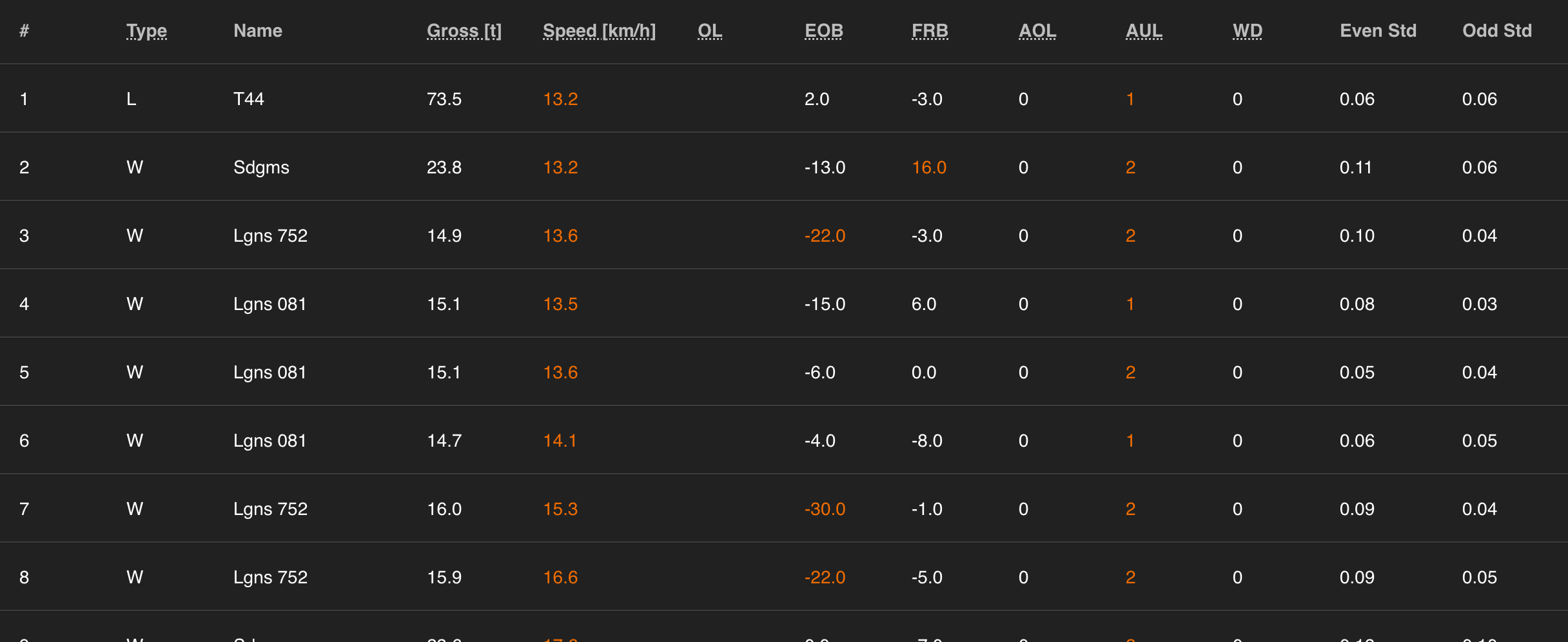 If the algorithm has been properly configured with the available site data, the system is also able to calculate the speed each axle is traveling and by extension the distance between each axle. The distance between axles is typically unique per wagon type, thus this information can also be used to convert axles into wagons and wagons into trains. To be able to classify wagons each wagon type must be input into the software, read more about how that works in this section: Wagon Type Classification.