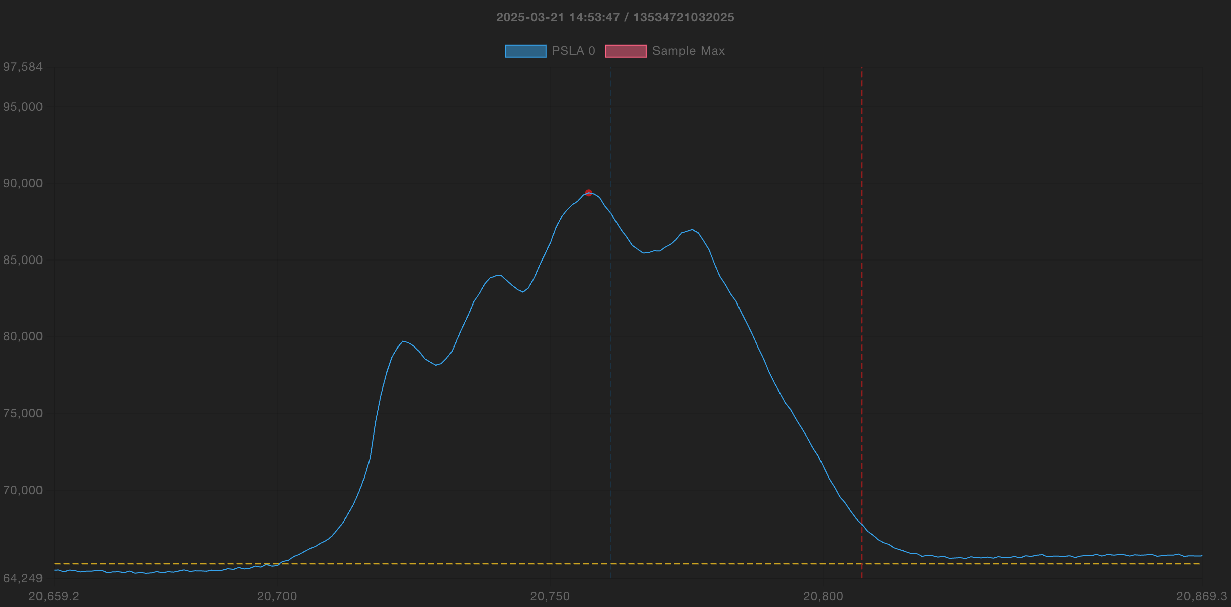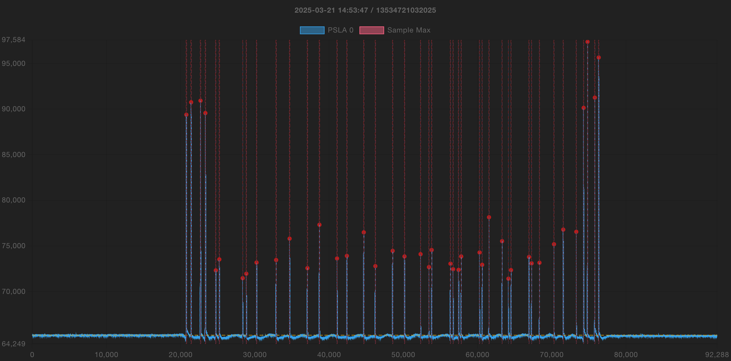 The image above shows the raw data for PSLA 0 where a train with one locomotive followed by wagons with 2-4 axles each. The red dots indicates the max amplitude for each axle which is used to calculate the weight of the axle. Zooming in on one axles allows us to see a detail of the signal: