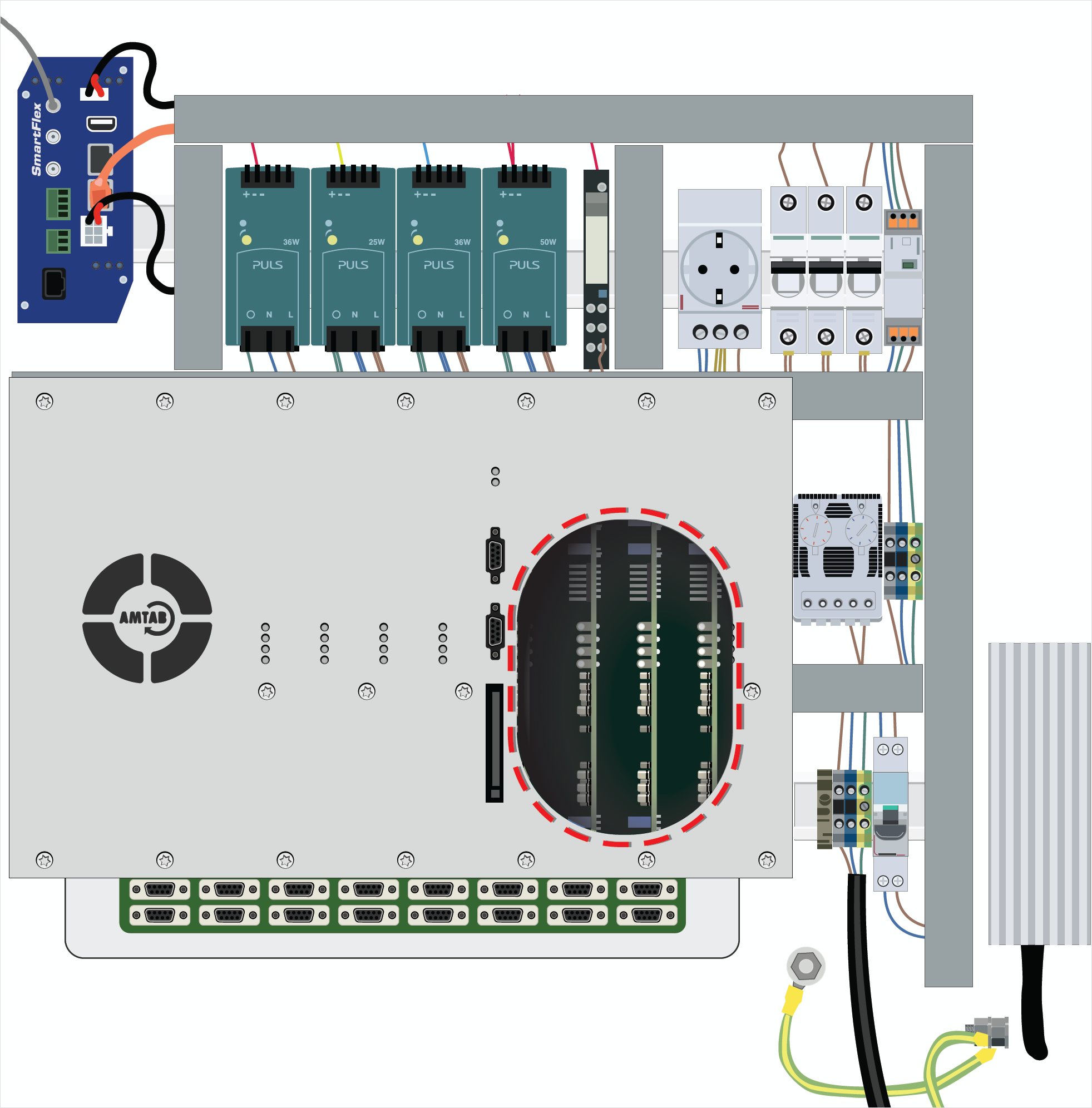Most of the components belonging to the AMTAB System are installed within the System Cabinet. The cabinet protects the components from the harsh environments often found by a railway track. The sturdy construction prevents weather and wear from damaging the sensitive equipment, and also shields the electronics from electromagnetic interference.